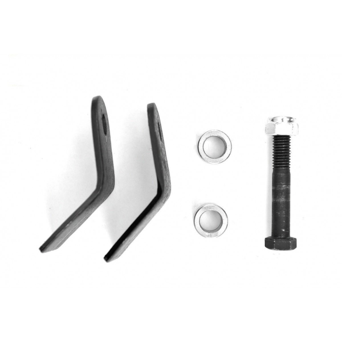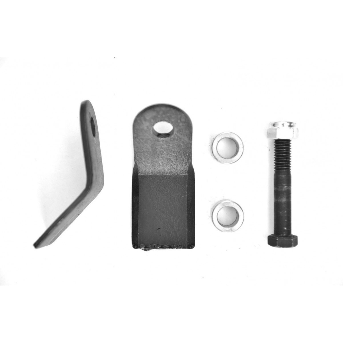 Prezentowany zestaw zawiera niezbędne elementy do szybkiego montażu i wymiany elementów roboczych w kosiarce bijakowej. Znajdują się w nim dwa noże typu Y, śruba typu M12x80 mm z nakrętką samokontrolującą M12, a także 2 tulejki. Otwór wewnętrzy tulejki posiada 14 mm, zewnętrzny 25 mm, natomiast szerokość 13 mm.