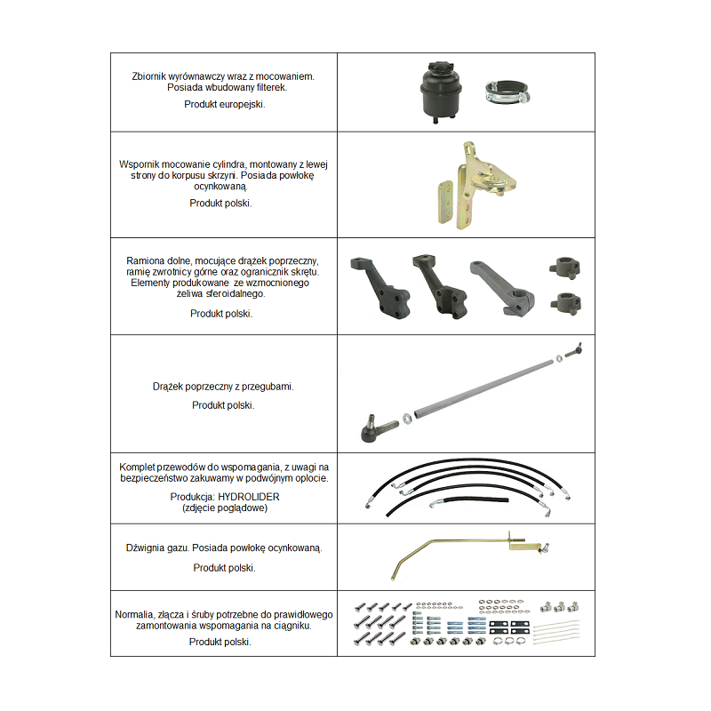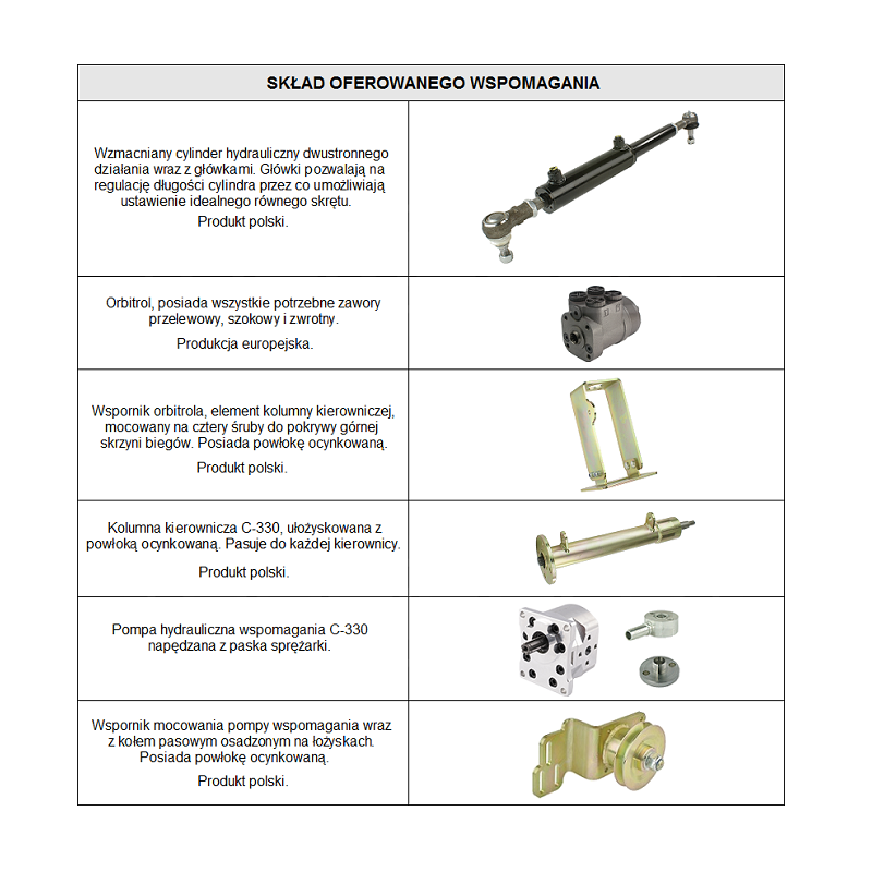 Dla bezpieczeństwa przewody hydrauliczne są w podwójnym oplocie stalowym. Wspomaganie kierownicy C-330 Premium obejmuje również: dźwignie gazu, ramiona, wspornik cylindra oraz normalia. Komplet śrub, złączy oraz elementów montażowych, które są niezbędne do instalacji zestawu. Oferowany zestaw składa się z najwyższej jakości komponentów, które umożliwiają lekką pracę kierownicy, nawet przy niskich obrotach silnika.