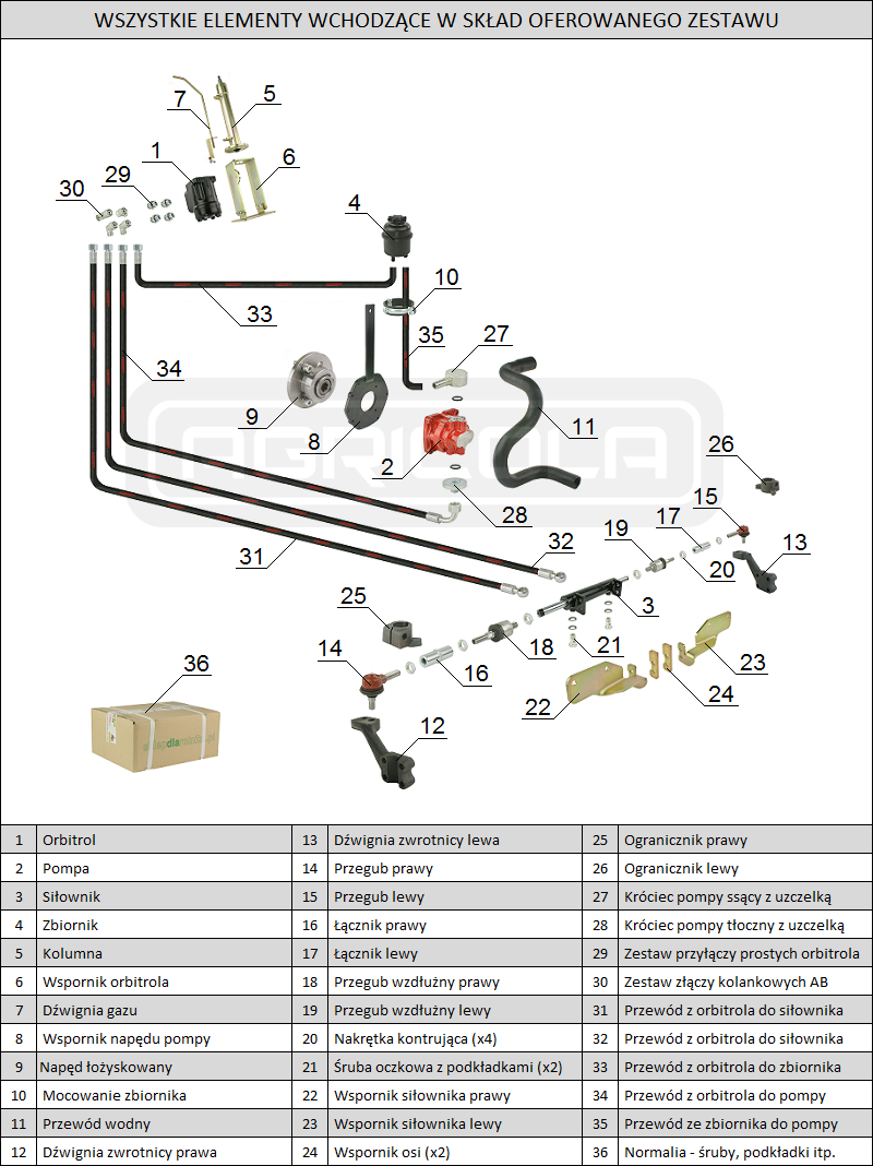Oferowany zestaw jest kompletnym rozwiązaniem, przygotowanym do samodzielnego montażu. Zawiera nie tylko główne podzespoły takie jak orbitrol, pompa, siłownik, czy przewodu hydrauliczne, ale również wszystkie niezbędne śrubki, nakrętki oraz podkładki. Użytkownik nie musi, więc dokupywać innych elementów. Do zestawu dołączona jest także szczegółowa instrukcja montażu, dzięki czemu instalacja staje się jeszcze prostsza. Nie wymaga ona specjalistycznych przeróbek konstrukcyjnych ciągnika. Montaż wspomagania kierownicy C-330 Ursus polega na wymianie oryginalnych elementów na nowe z zestawu.