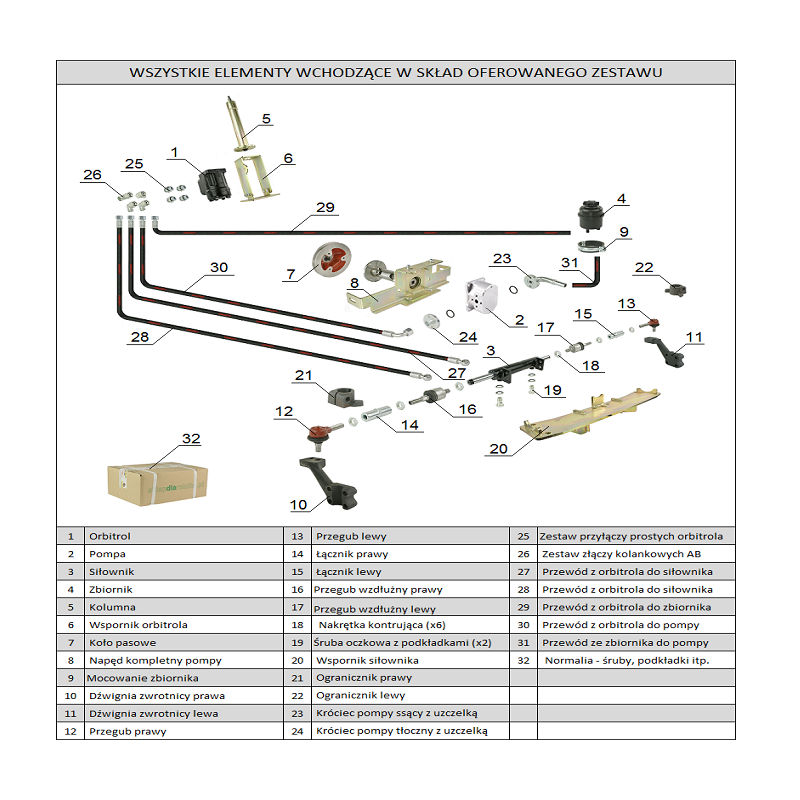 Nowoczesna kolumna kierownicza obejmuje między innymi oryginalny orbitrol Danfoss z zaworem bezpieczeństwa, wspornik orbitrola oraz komplet króćców przyłączeniowych. Orbitrol marki Danfoss, gwarantuje idealne prowadzenie kierownicy i długą żywotność układu. Jego wbudowany zawór bezpieczeństwa chroni instalację przed przeciążeniami hydraulicznymi.