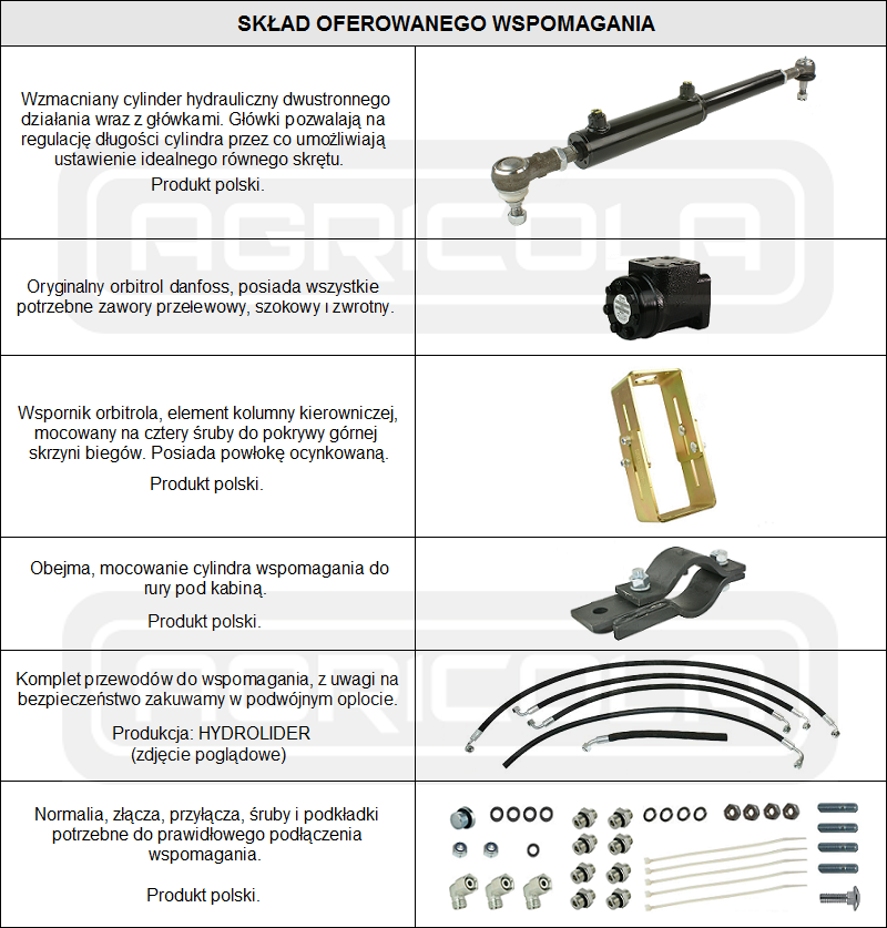Kluczowym elementem tego zestawu jest oryginalny orbitrol Danfoss. Wyposażony on jest w komplet niezbędnych zaworów: przelewowych, szokowych i zwrotnych. Orbitrol cechuje się niezawodnością, precyzyjną pracą oraz wysoką żywotnością. Dzięki temu jest przygotowany do intensywnej oraz wieloletniej eksploatacji. W nowym układzie hydraulika kierownicza działa płynniej, szybciej oraz znacznie lżej, nawet podczas pracy z dużym obciążeniem.