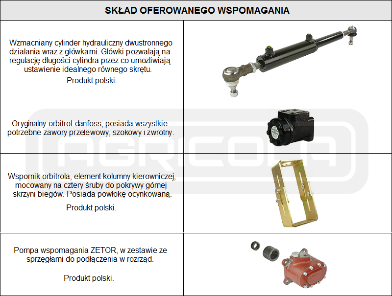 - Zastosowanie: ciągniki niewyposażone fabrycznie w jakiekolwiek wspomaganie